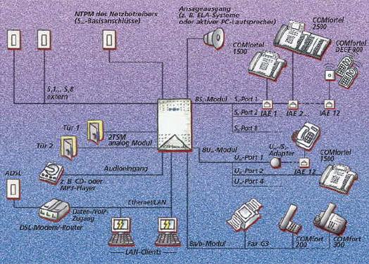Bis 26 Teilnehmer finden an dieser genialen Anlage Anschluss. Die 2-Draht-UP0-Technik der ISDN-Nebenstellen ermöglicht sogar den Anschluss der modernen COMfortel-Systemtelefone über vorhandene, „alte“ Analogleitungen.