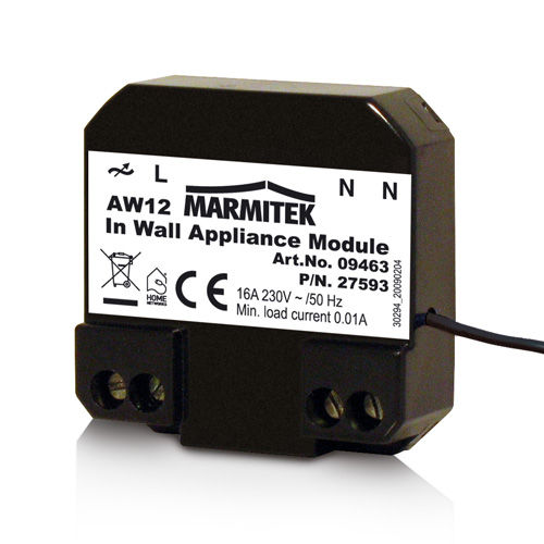 Das AW12 MicroModul ist ein sehr kompaktes Marmitek Schaltermodul, welches hinter vorhandenen Schaltern und Wandsteckdosen eingebaut werden kann. Die Beleuchtung oder das mit dem AW12 verbundene Gerät wird mit dem Marmitek X-10 System gesteuert. Der bereits vorhandene Schalter kann auch weiterhin zum Ein/Ausschalten benutzt werden. Das AW12-Module bedient sich der Einweg-Kommunikation.